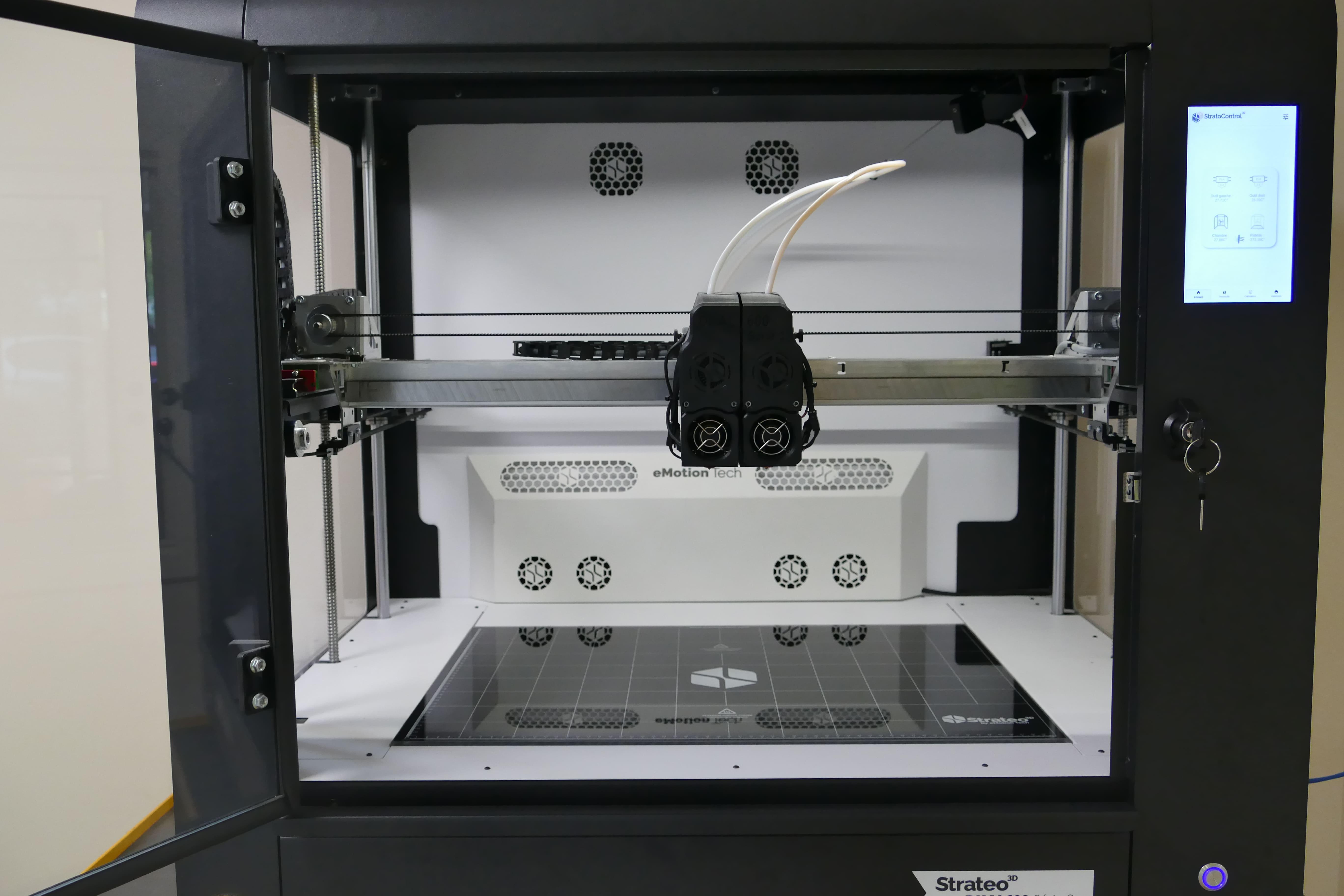 - La Strateo3D DUAL600 Série 2 est une imprimante 3D industrielle conçue sur la base de la technologie Fused Filament Fabrication (FFF). Cette dernière offre une grande variété de polymères imprimables s'adaptant aux besoins de l'utilisateur ainsi qu'une robustesse et une fiabilité inégalée.